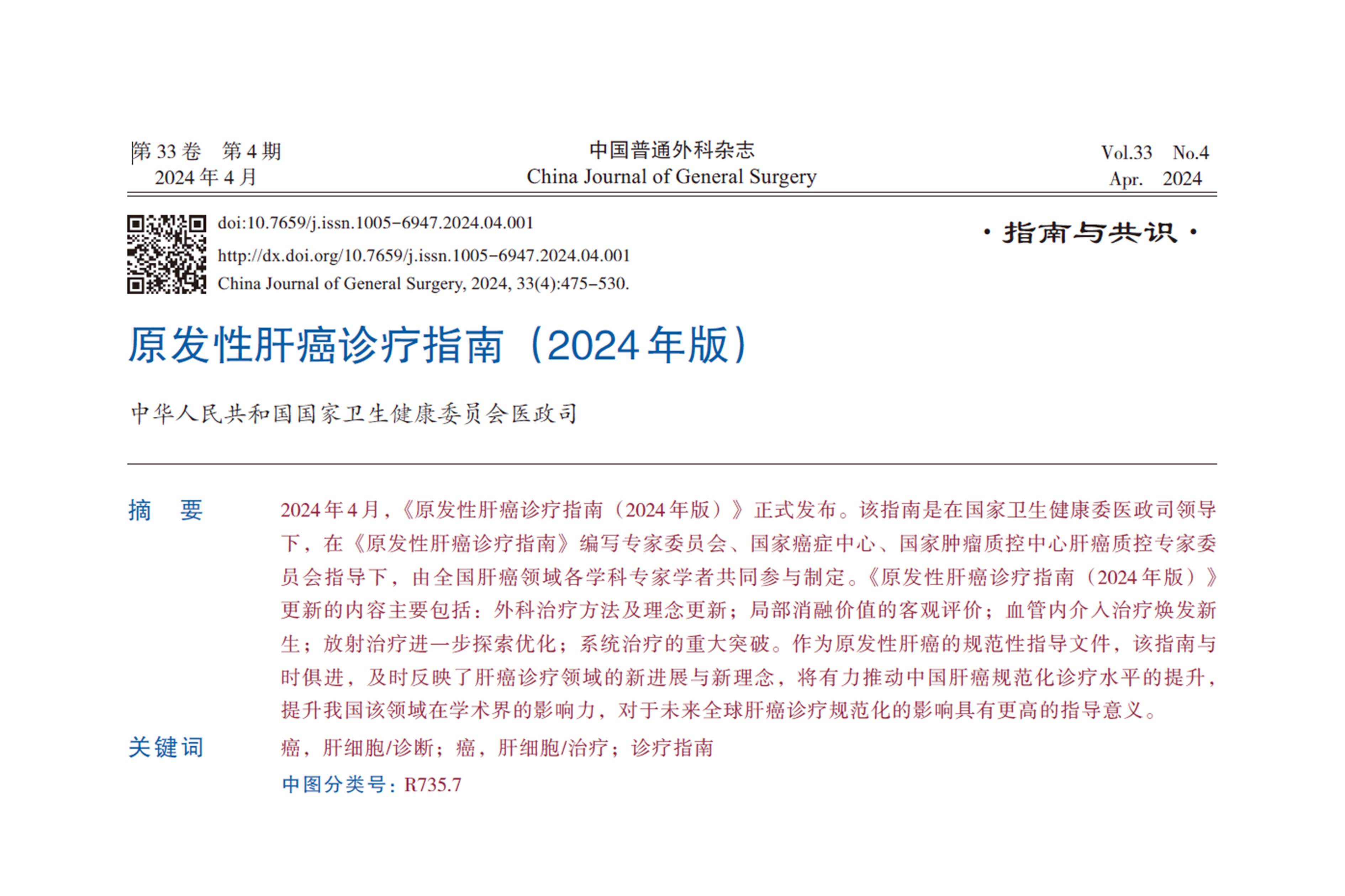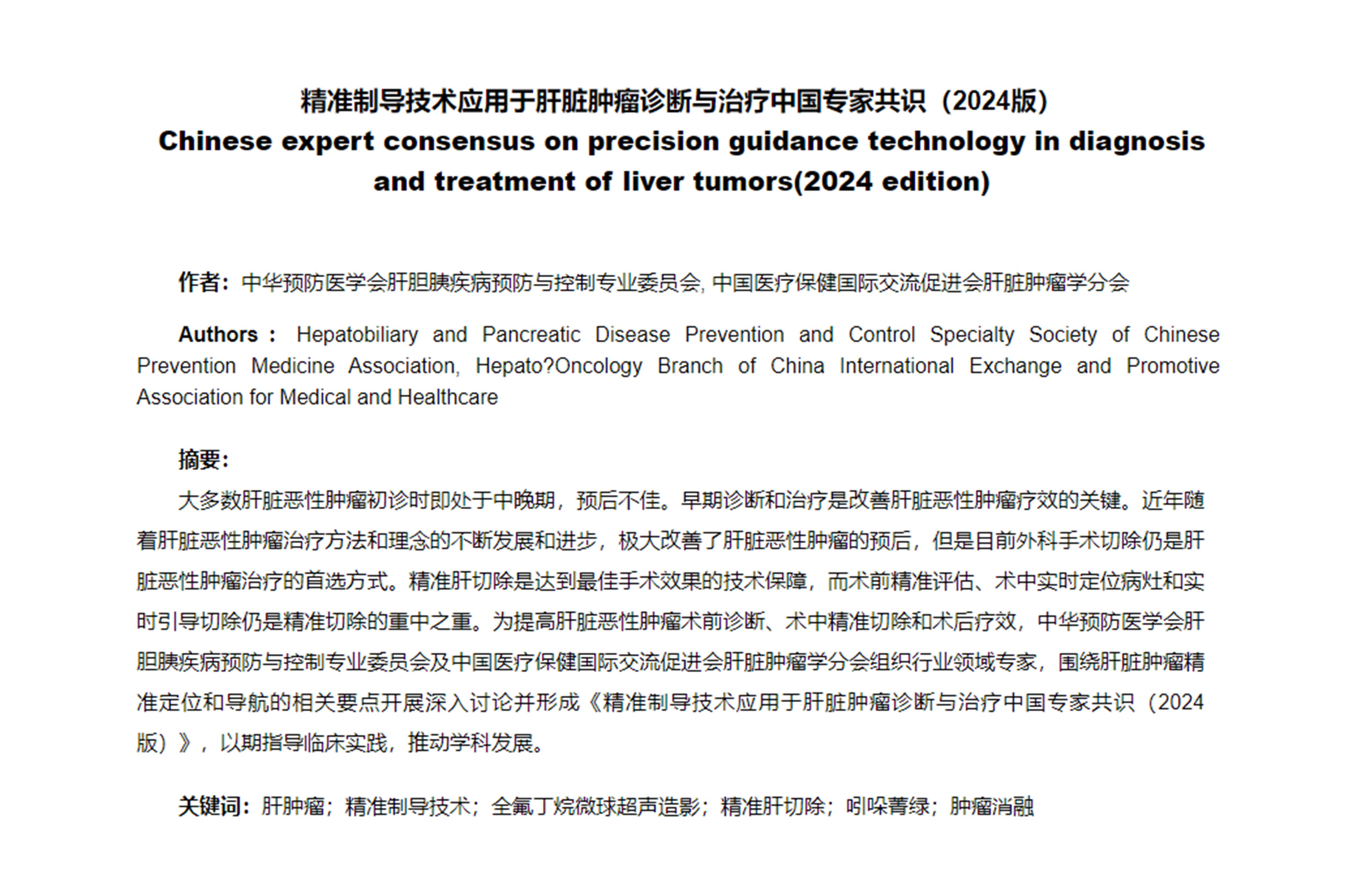 为提高肝脏恶性肿瘤术前诊断、术中精准切除和术后疗效,围绕肝脏肿瘤精准定位和导航的相关要点开展深入讨论并形成《精准制导技术应用于肝脏肿瘤诊断与治疗中国专家共识(2024版)》,以期指导临床实践,推动学科发展...